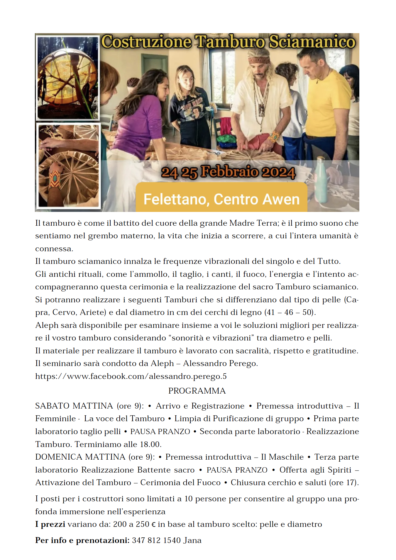 costruzione del tamburo sciamanico e venerdì 23 febbraio ore 19.30 CERIMONIA DI OFFERTA ALLA MADRE TERRA sabato 24 febbraio 2024 09:00 domenica 25 febbraio 2024 17:00 CENTRO AWEN 10 Via del Risorgimento Felettano, Friuli-Venezia Giulia, 33019 Italia (mappa) Google Calendar ICS
